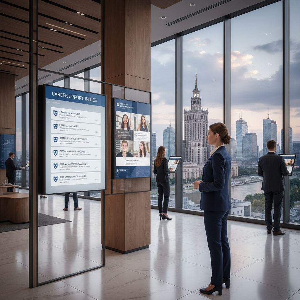 - Znajomość najnowszych trendów: bankowość mobilna, ESG, cyberbezpieczeństwo.